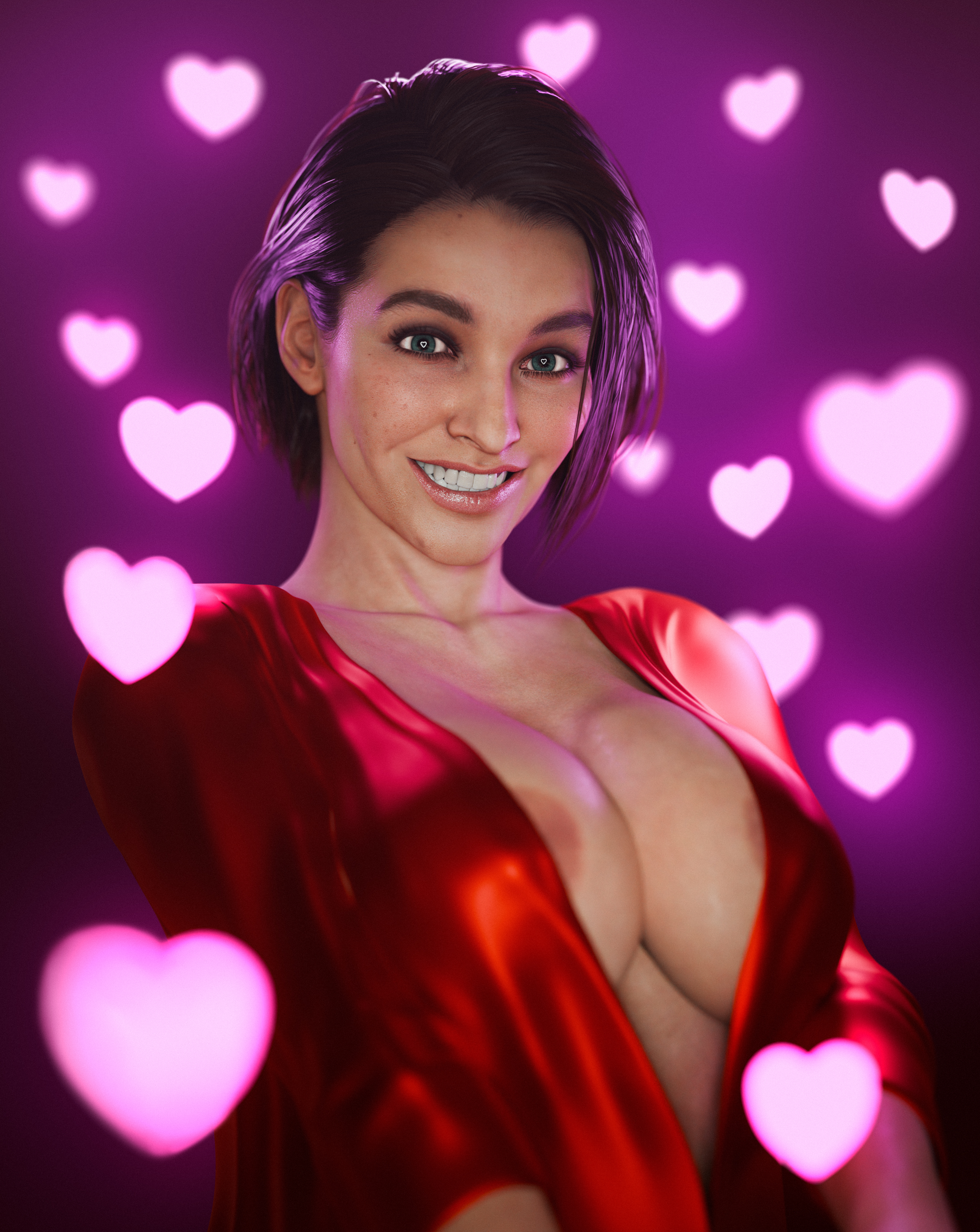 Jill Valentine smiling at the viewer with heart-shaped pupils.