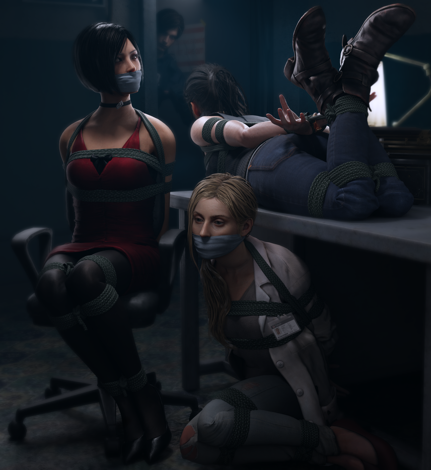 Ada Wong, Claire Redfield, and Annette Birkin bound and gagged in chairs.