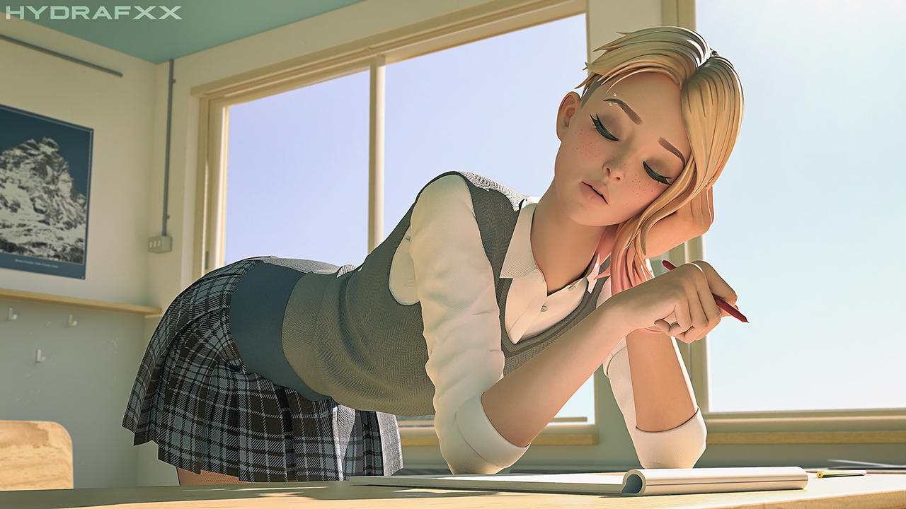Gwen Stacy sitting at a desk looking back at the viewer.