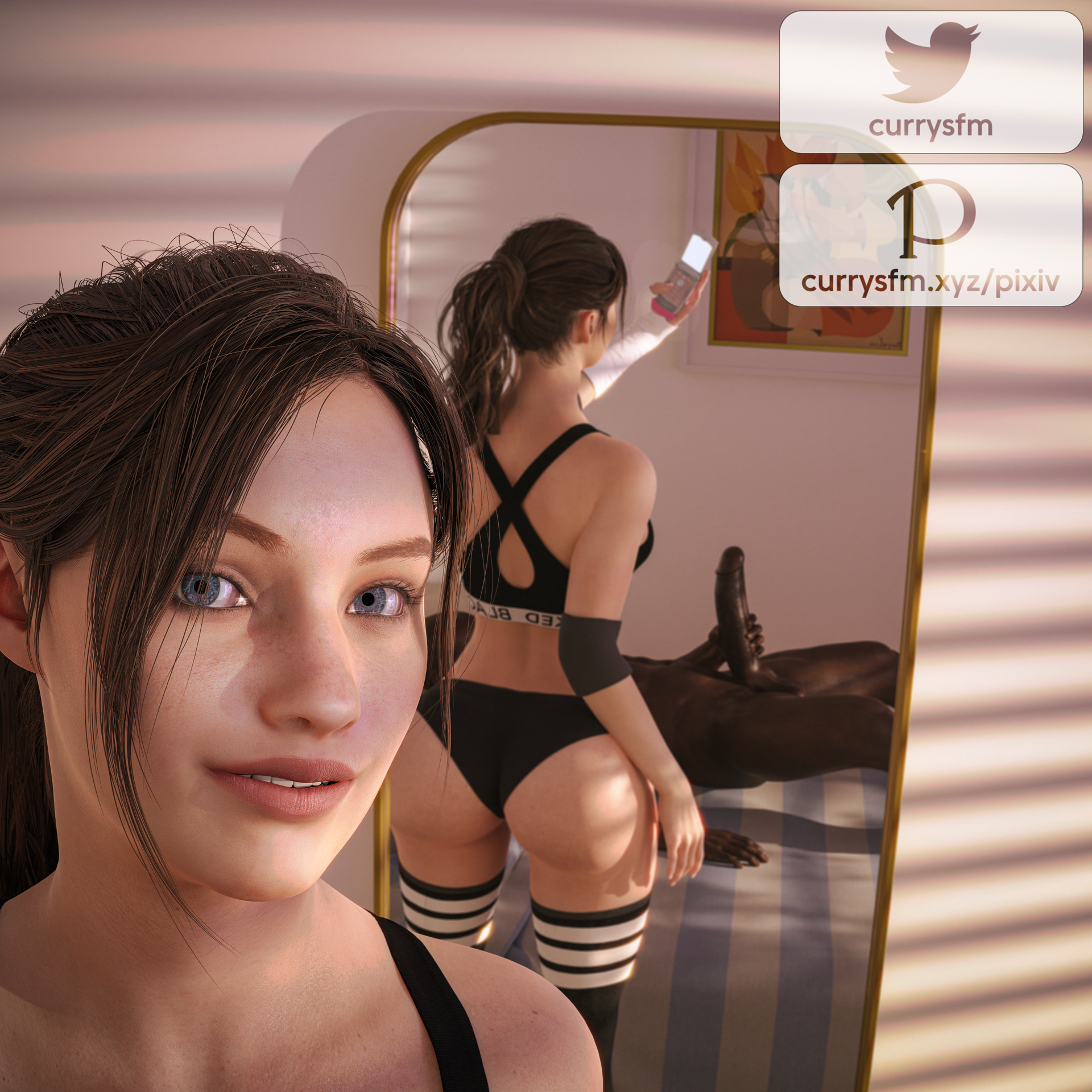 Claire Redfield looking at the viewer in a mirror selfie with a dark-skinned male