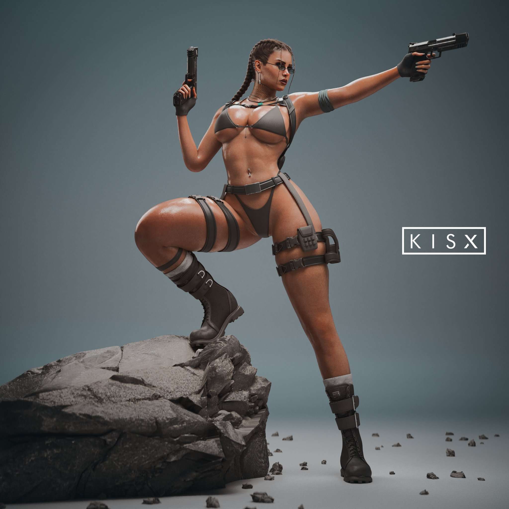 Lara Croft showing off her big ass in boots and sunglasses while posing with a gun
