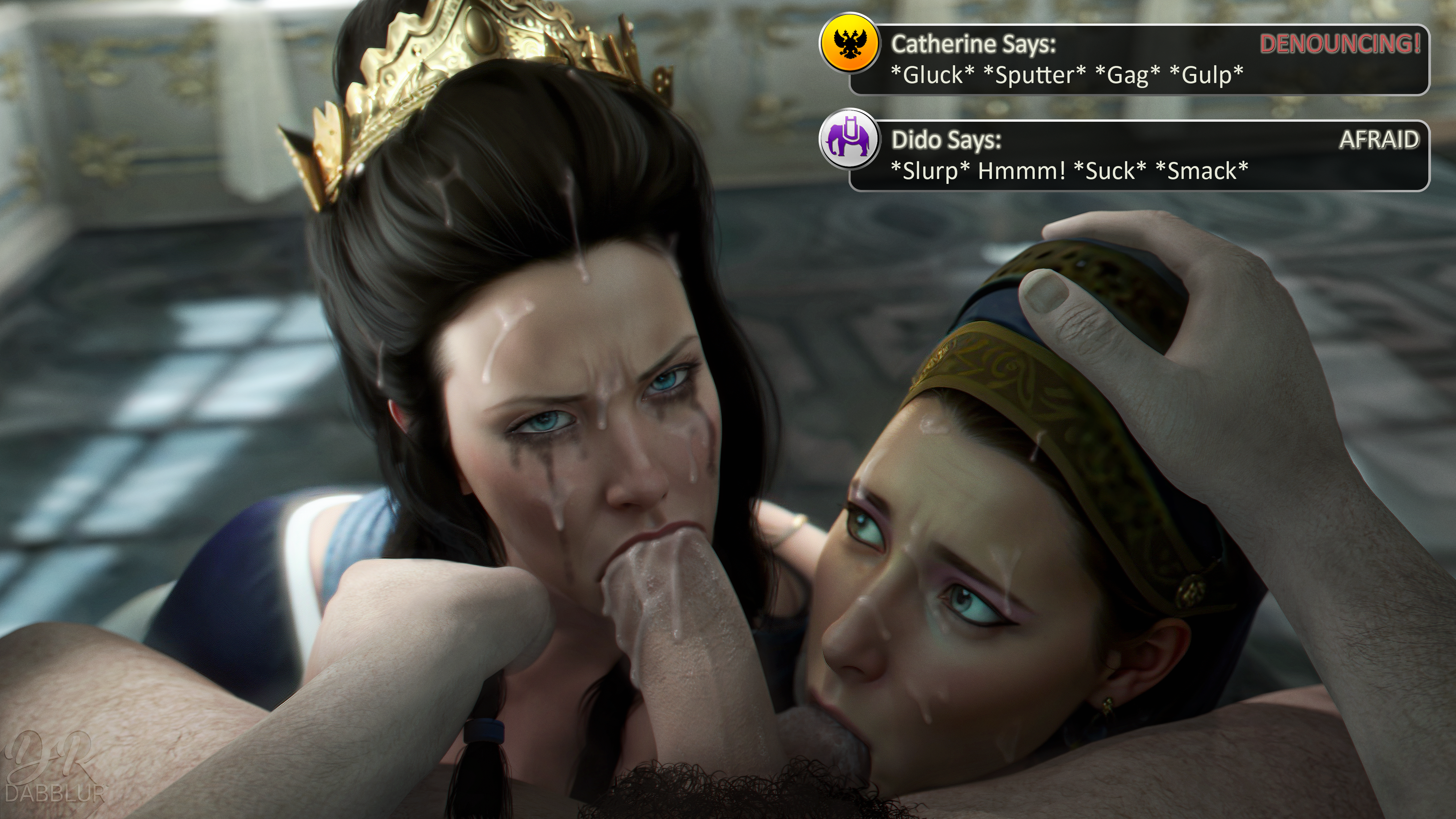 Catherine II of Russia and Dido of Carthage giving a blowjob to a man