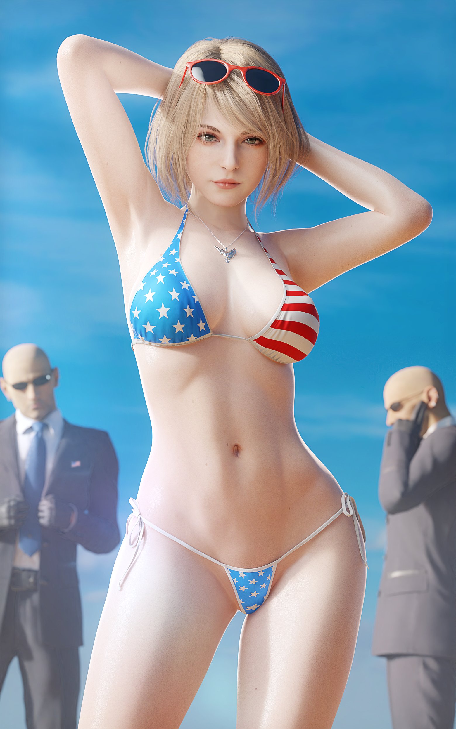 Ashley Graham and Ada Wong posing by the pool.