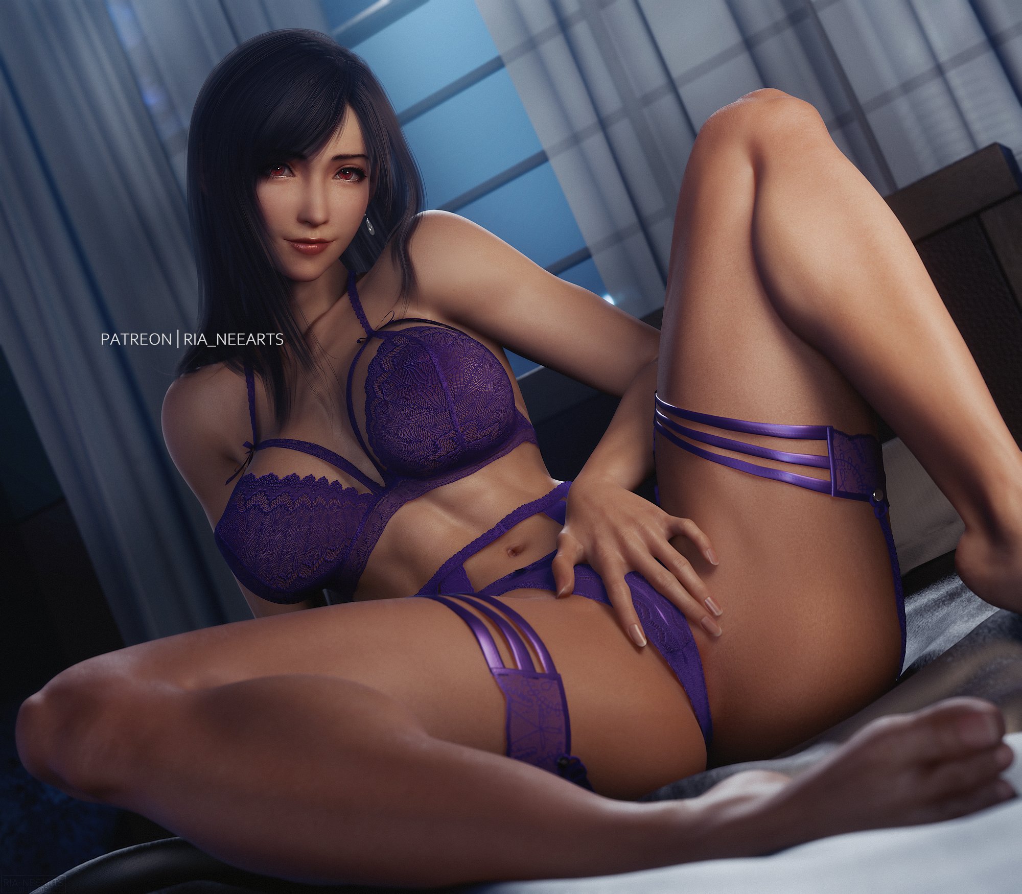 Tifa sitting on bed, legs spread and hand on pussy in see-through purple lingerie